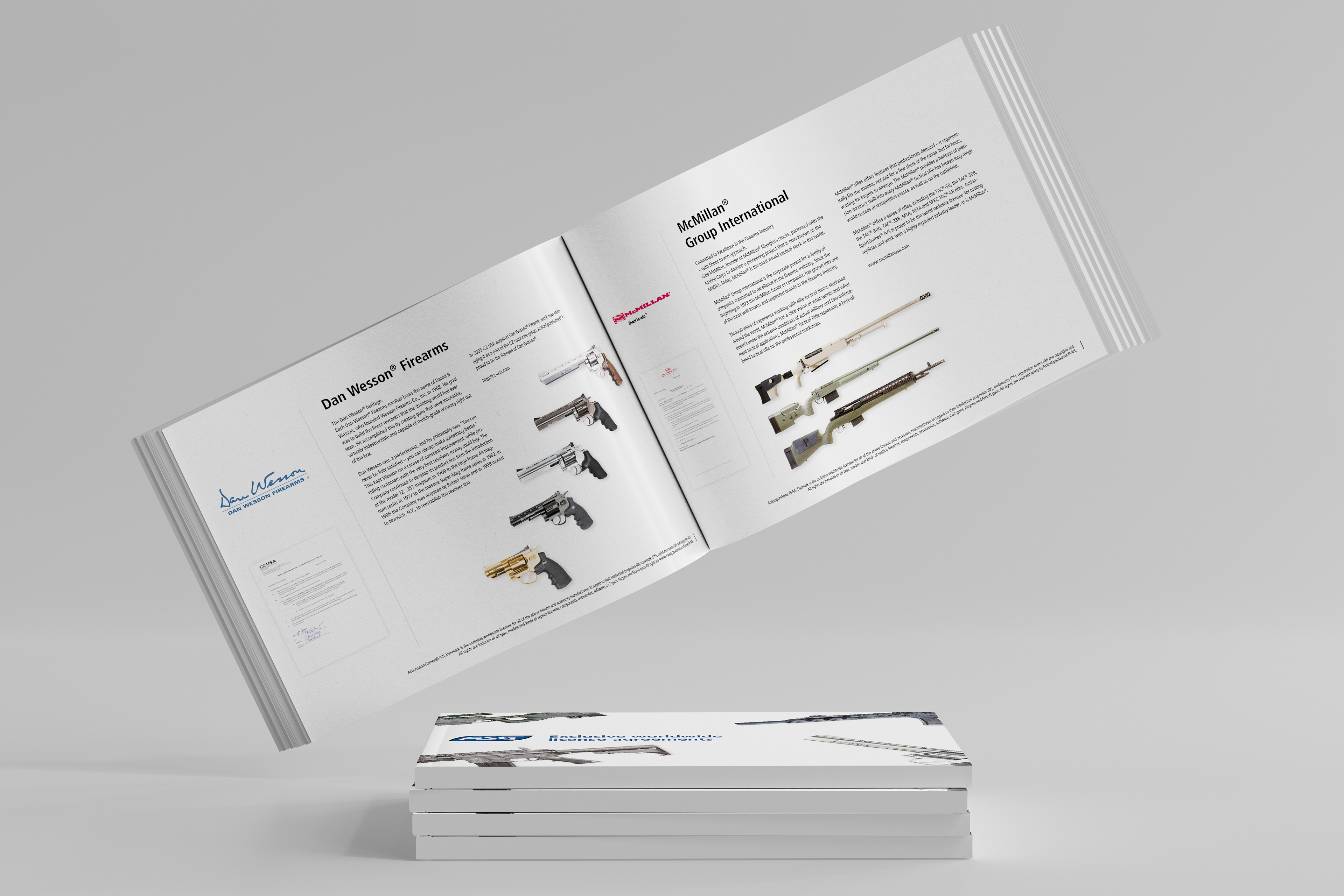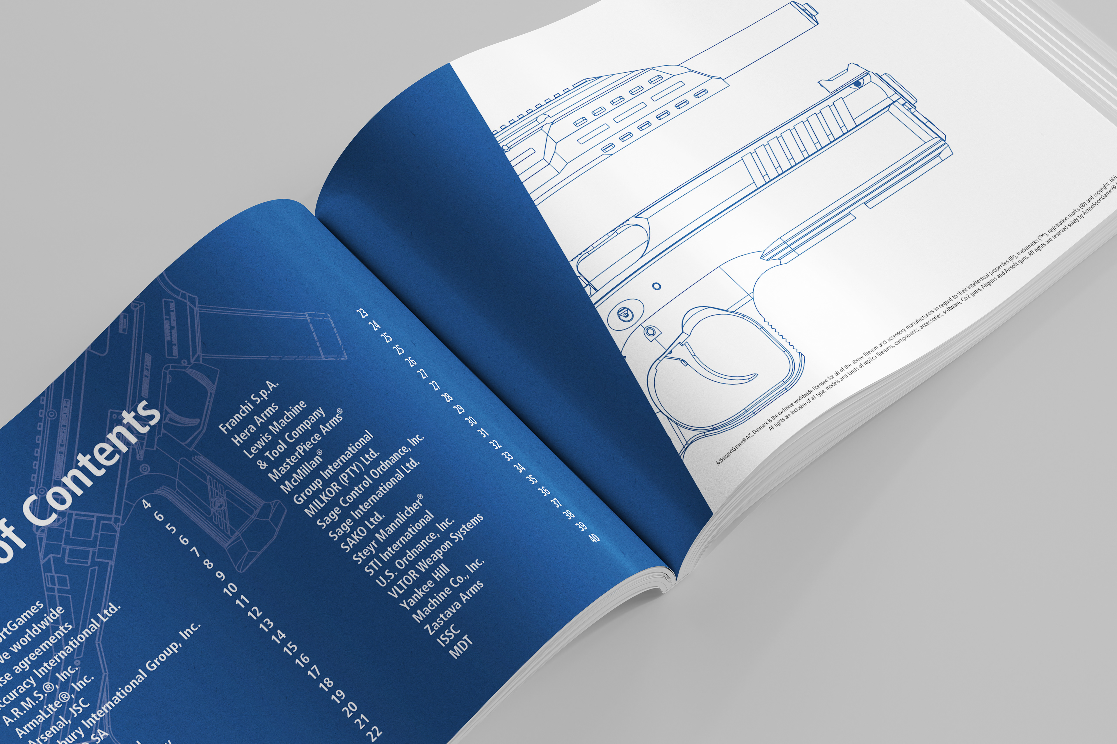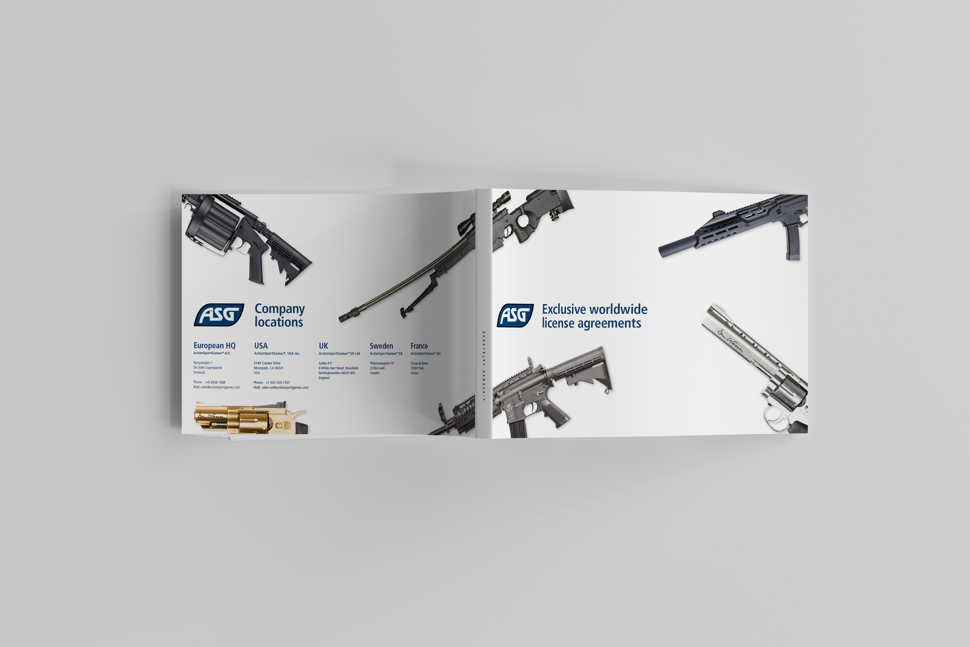 Design of a catalogue for ActionSportGames, showcasing their complete range of licenses for manufacturing replica airsoft guns.